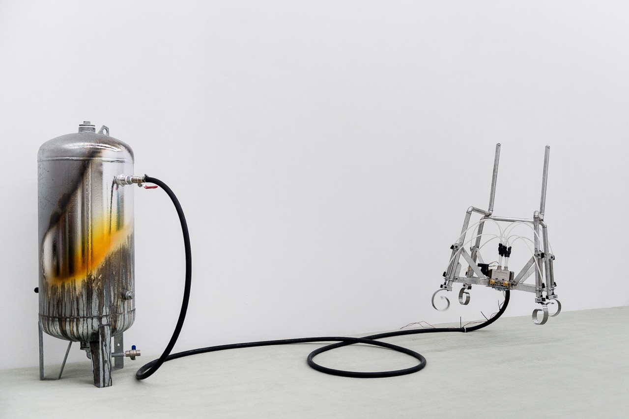 Based on the essential nature of the machine – an instrument communicating a motion – and in order to show how objects are capable of producing a narrative, Dorian Gaudin reminds us of how the fetishisms of objects and technology governs our relationship with the world. His installations often include masterfully engineered machines that lack any explicit purpose, yet move spontaneously, animated from within. These autonomous and unpredictable works of art allow us to question the nature of objects and whether we engage with machines as active users or passive viewers. Gaudin’s wall sculptures then appear as a frozen will and testament of his installations and the movement (violence?) they contain.