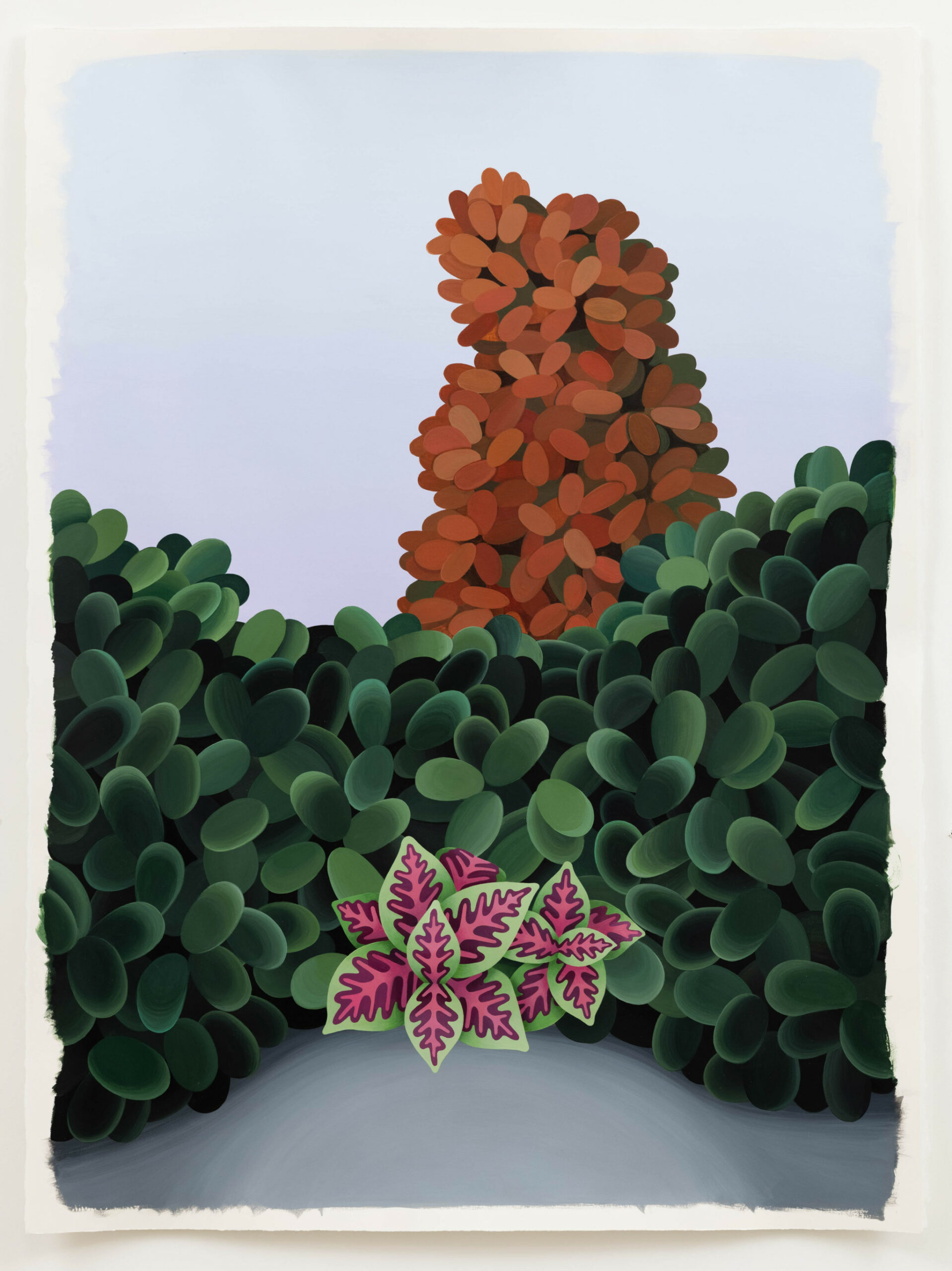 Les peintures et les dessins de Shaffer explorent un monde imaginaire fait de formes et d’environnements idéalisés, et les cadres -sinon les limites- à travers lesquels nous rationalisons l’expérience de l’imagination. Dans les univers qu’elle crée, le jour et la nuit existent parfois en même temps, la perspective faiblit, le temps et l’agitation inhérente à la vie semblent suspendus, et les seules figures qui apparaissent sont des statues de pierre d’apparence feminine. Shaffer considère ces espaces et jardins fictifs comme des explorations théoriques de l’architecture, de la lumière, du temps, du contrôle et de la couleur, et comme des hommages aux espaces que les femmes construisent, créent et occupent.